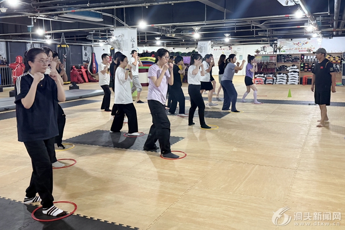 晚上8點的海魚兒武道館燈火通明,20多名職工在專業(yè)教練的帶領(lǐng)下,隨著節(jié)奏有力地出拳口令練習(xí)。